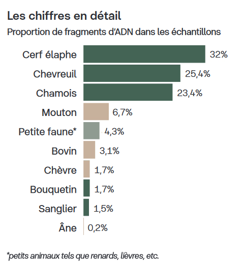 Les analyses montrent une large prédominance des ongulés sauvages : cerf élaphe, chevreuil et chamois principalement. Les animaux domestiques représentent 11,7 % des proies consommées.